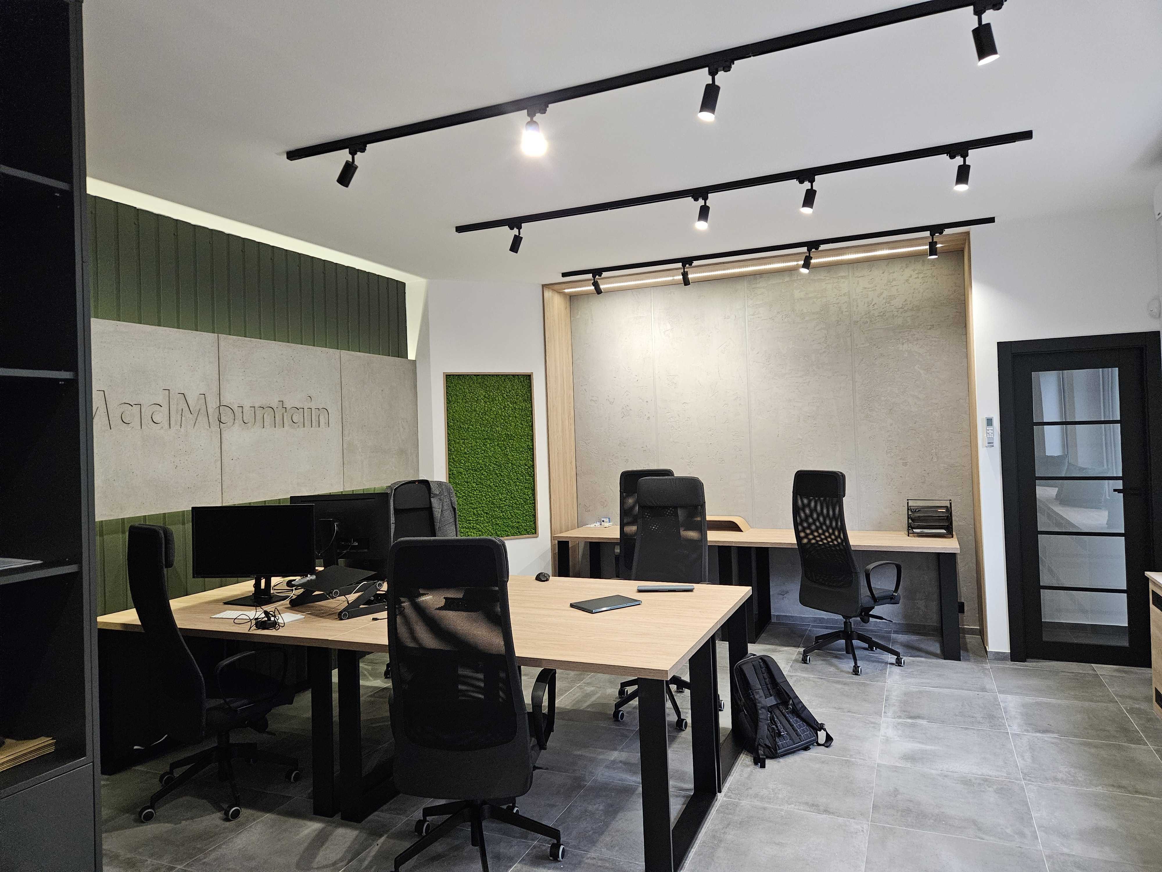W kwestii wystroju postawiliśmy na nowoczesny design, który łączy w sobie elementy betonu, drewna oraz roślinności. Wyjątkowym akcentem jest logo naszej firmy umieszczone tuż przy wejściu. Priorytetem podczas projektowania było stworzenie przestrzeni pracy, w której każdy pracownik znajdzie odpowiednie warunki. Udało nam się wygospodarować liczne stanowiska pracy, strefę relaksu oraz salę konferencyjną. Dodatkowo, na zewnątrz znajduje się niewielki ogródek, idealny do odpoczynku na leżaku, zaczerpnięcia oddechu czy zrobienia sobie krótkiej przerwy od codziennych zadań.